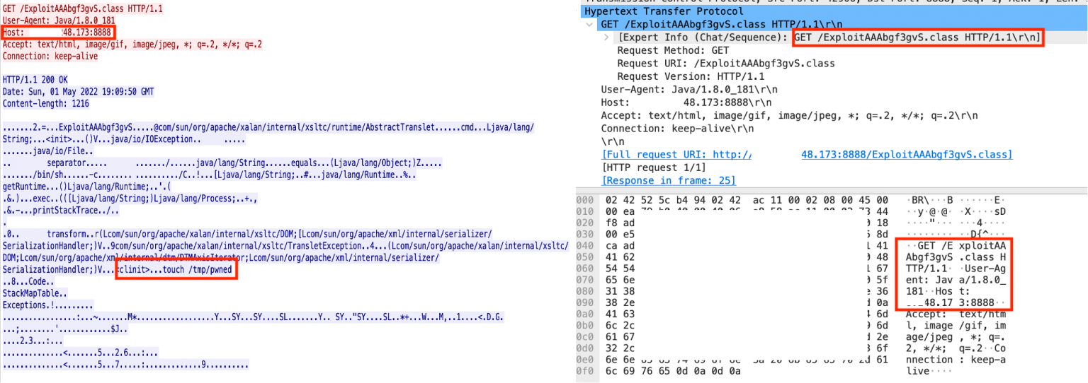 WireShark로 패킷을 분석 한 결과 Destination IP 192.168.38.173:8888 ExploitAAAbgfs3gvS.class 를 요청하여 성공적으로 조회 된 것으로 확인 되었습니다.