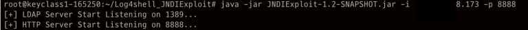 JNDIExploit 사용 하여 ex)JNDIExploit-1.2-SNAPSHOT.jar -i 192.168.38.173 -p 8888 LDAP 서버를 실행하도록 함으로써 1389, 8888 포트를 Listening 상태로 만들었습니다.